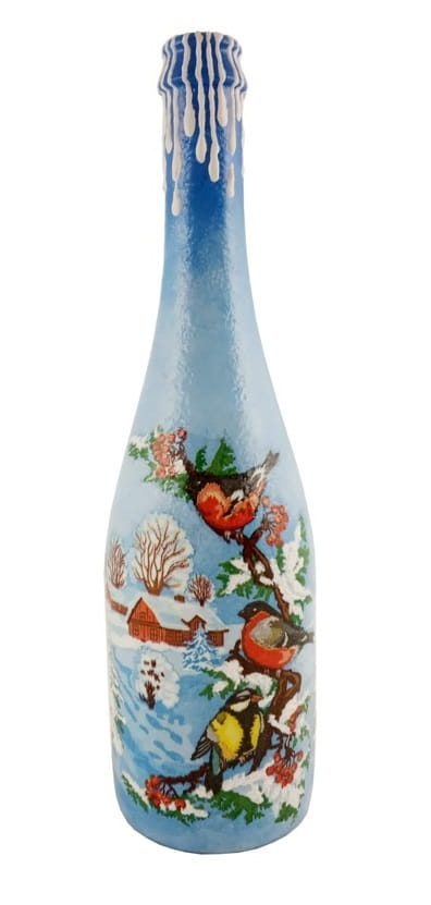 Butelka szklana ręcznie ozdobiona techniką decoupage.