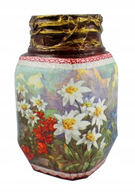 Słoik szklany ręcznie ozdobiony techniką decoupage.