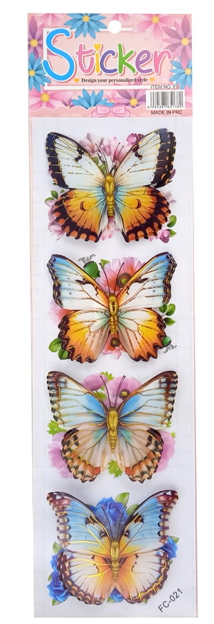 Piękne naklejki przeźroczyste foliowe 3D, motyle na tle kwiatów.