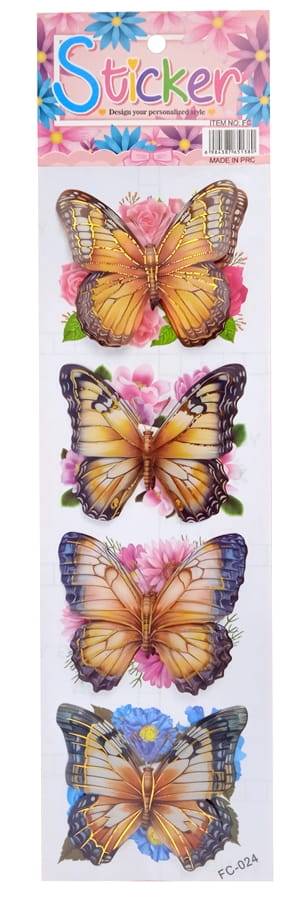 Piękne naklejki przeźroczyste foliowe 3D, motyle na tle kwiatów.