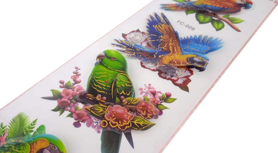 Piękne naklejki przeźroczyste foliowe 3D, ptaki na tle kwiatów.