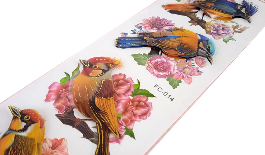 Piękne naklejki przeźroczyste foliowe 3D, ptaki na tle kwiatów.
