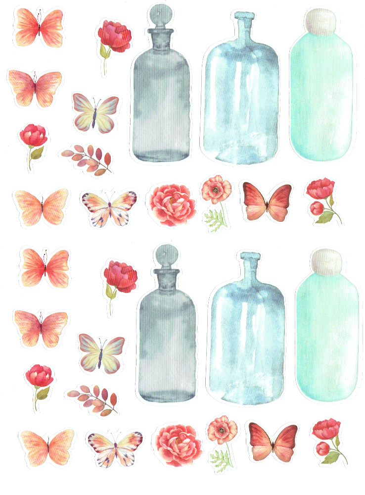 (10 kwiatów, 12 motyli, 2 liście, 6 butelek)