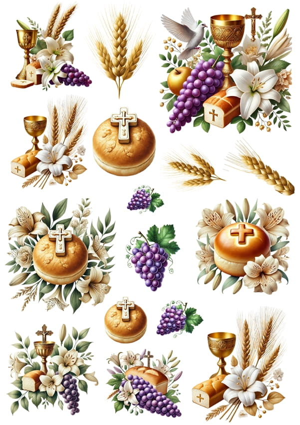 - Pierwsza Komunia Święta, hostia, krzyż, winogrona, kwiaty