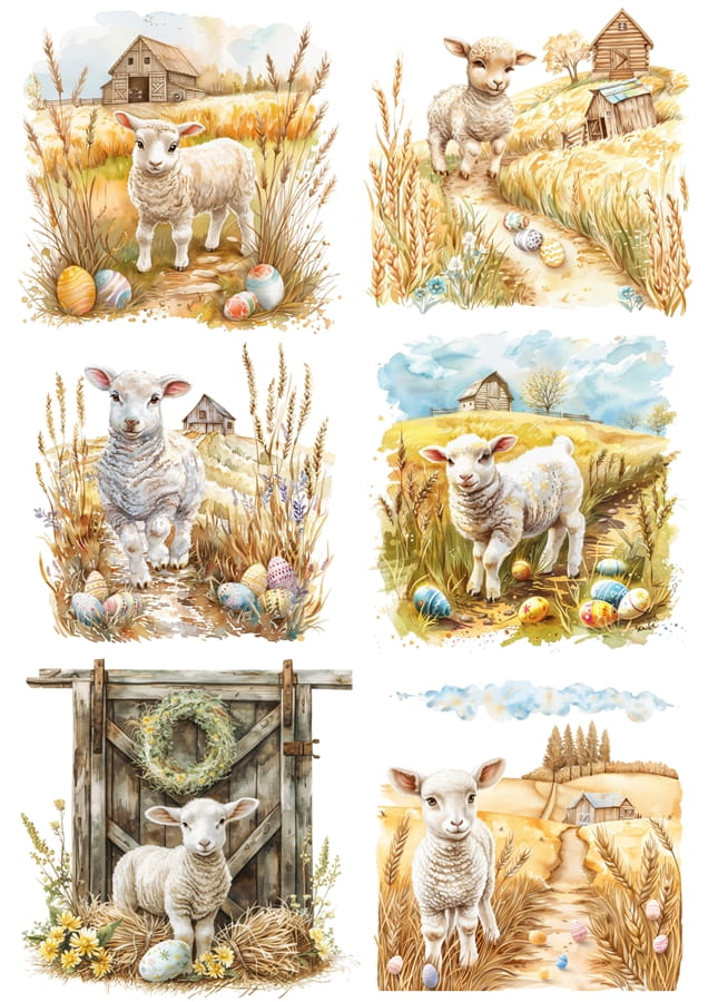 Papier klasyczny A4 do decoupage - Wielkanoc, baranki, owieczki, jagnięta, jajka, farma, deski