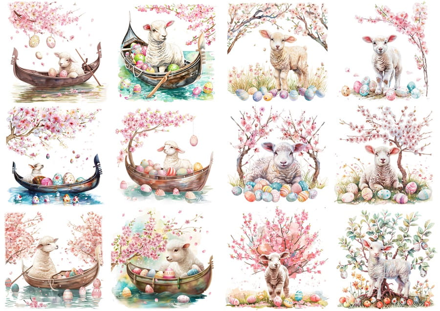Papier klasyczny A4 do decoupage - Wielkanoc, baranki, owieczki, jagnięta, pisanki, kwiaty, łódka
