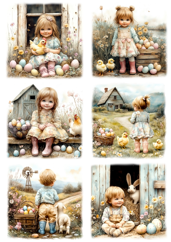 Papier klasyczny A4 do decoupage - Wielkanoc, dzieci, farma, kurczaki, kury, pisanki
