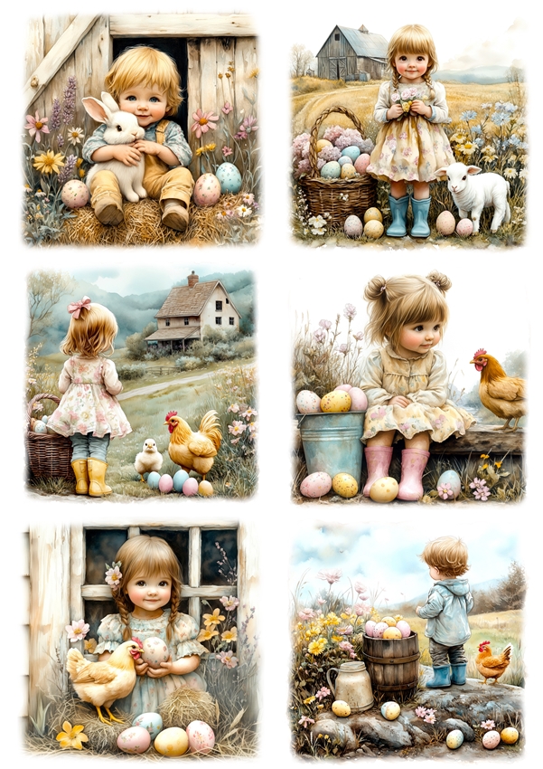 Papier klasyczny A4 do decoupage - Wielkanoc, dzieci, farma, kurczaki, kury, pisanki