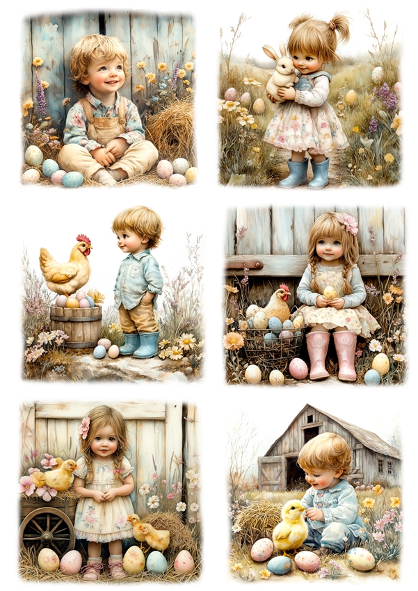 Papier klasyczny A4 do decoupage - Wielkanoc, dzieci, farma, kurczaki, kury, pisanki
