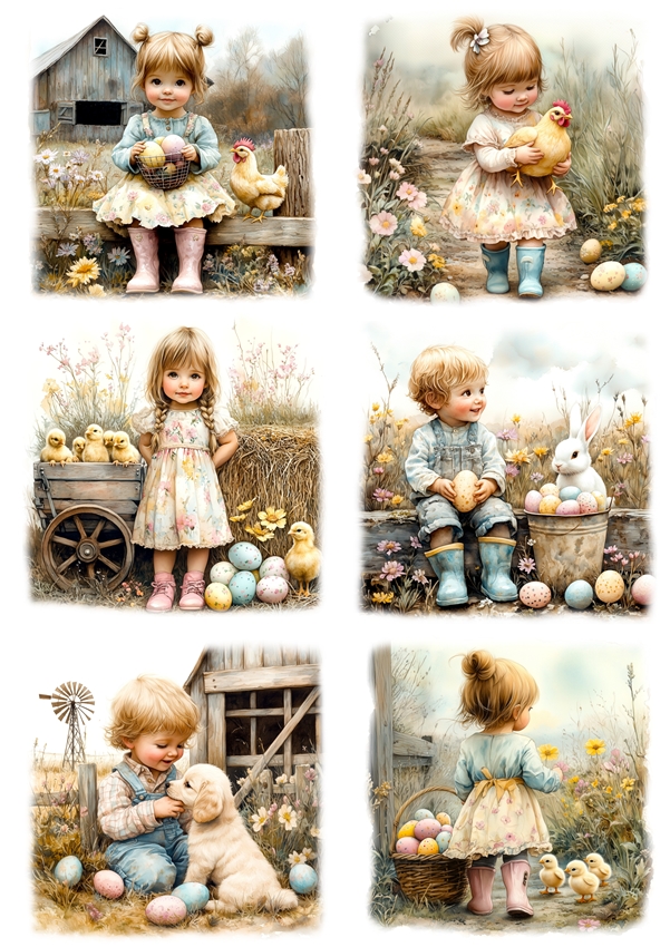 Papier klasyczny A4 do decoupage - Wielkanoc, dzieci, farma, kurczaki, kury, pisanki