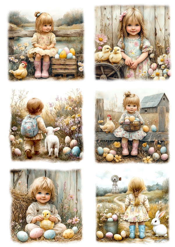 Papier klasyczny A4 do decoupage - Wielkanoc, dzieci, farma, kurczaki, kury, pisanki
