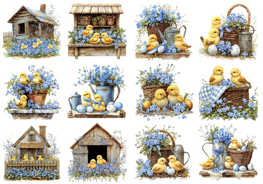 Papier klasyczny A4 do decoupage - Wielkanoc, kurczaki, koszyki, kwiaty, niezapominajki