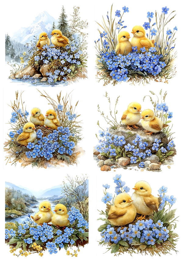 Papier klasyczny A4 do decoupage - Wielkanoc, kurczaki, kwiaty, niezapominajki