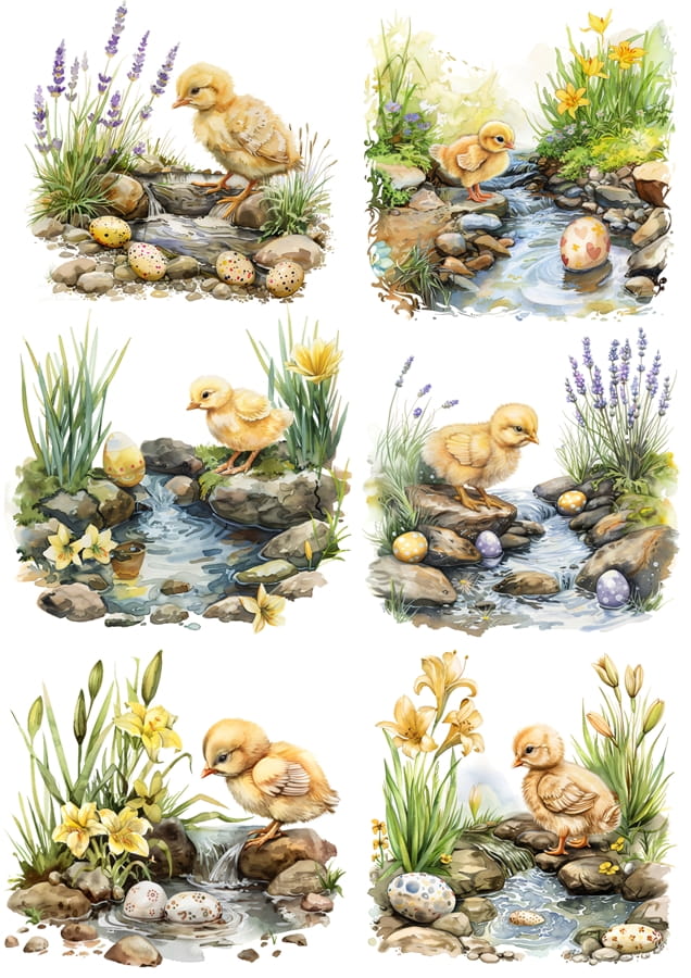 Papier klasyczny A4 do decoupage - Wielkanoc, kurczaki, pisanki, kwiaty , staw, strumyk