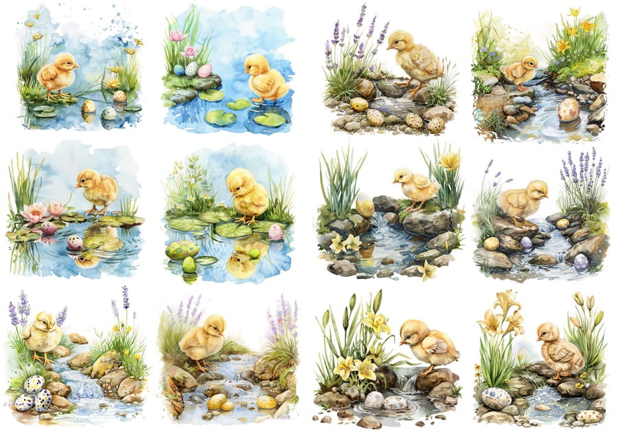 Papier klasyczny A4 do decoupage - Wielkanoc, kurczaki, pisanki, kwiaty , staw, strumyk