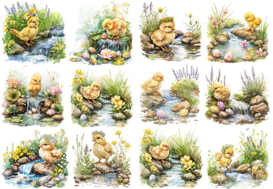 Papier klasyczny A4 do decoupage - Wielkanoc, kurczaki, pisanki, kwiaty , staw, strumyk
