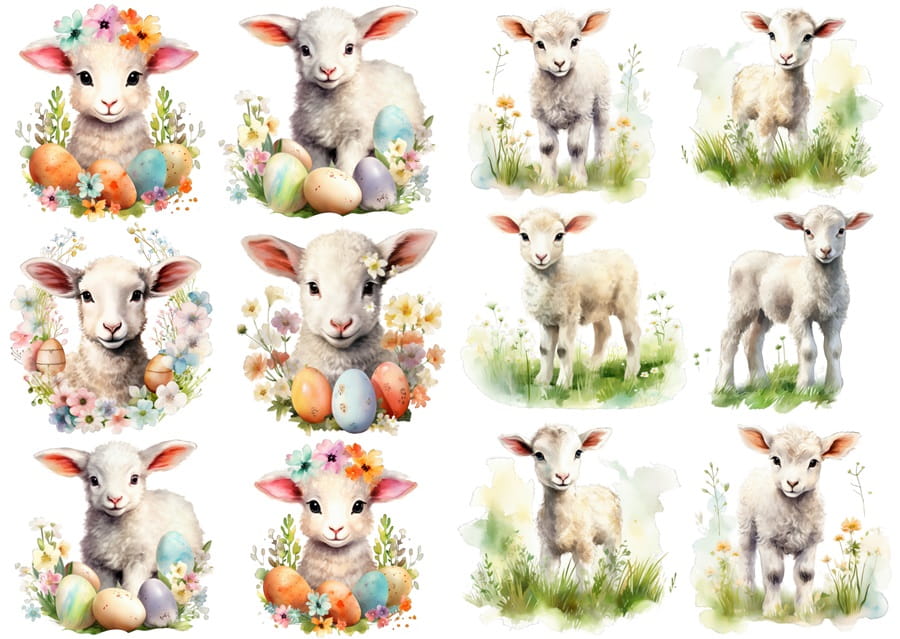Papier klasyczny A4 do decoupage - Wielkanoc , baranki, owce, jagnięta, pisanki, kwiaty