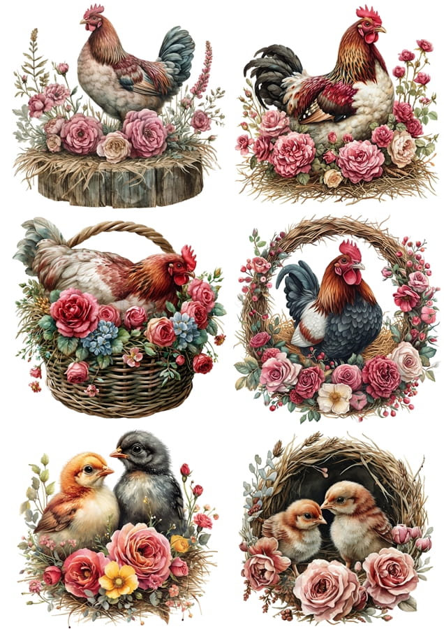 Papier klasyczny A4 do decoupage - Wielkanoc , kury, koguty, kurczaki, gniazda, koszyki, kwiaty, róże