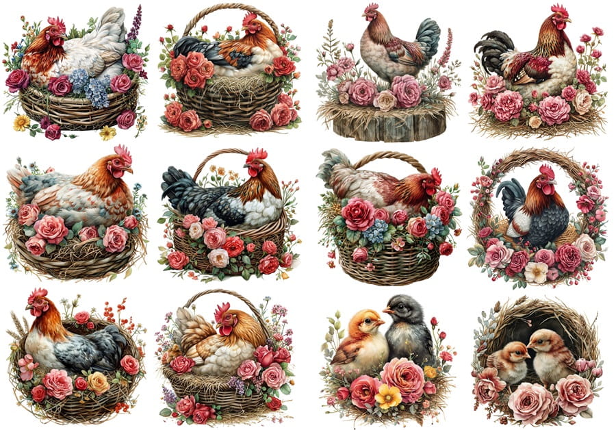 - Wielkanoc, kury, koguty, kurczaki, gniazda, koszyki, kwiaty, róże