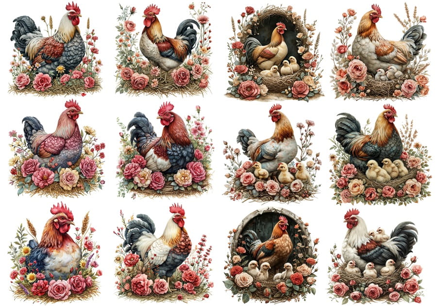 Papier klasyczny A4 do decoupage - Wielkanoc , kury, koguty, kurczaki, gniazda, koszyki, kwiaty, róże