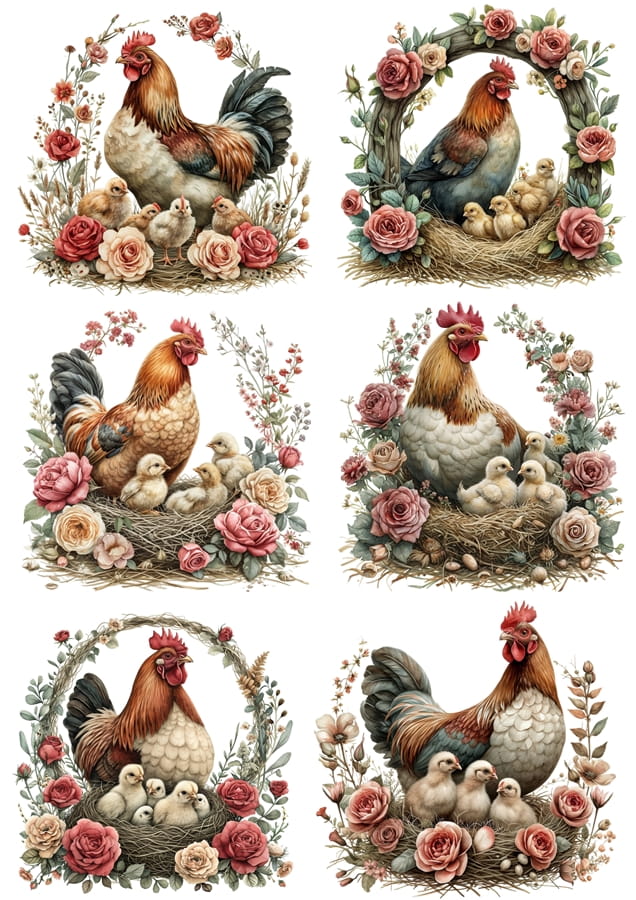 Papier klasyczny A4 do decoupage - Wielkanoc , kury, koguty, kurczaki, gniazda, kwiaty