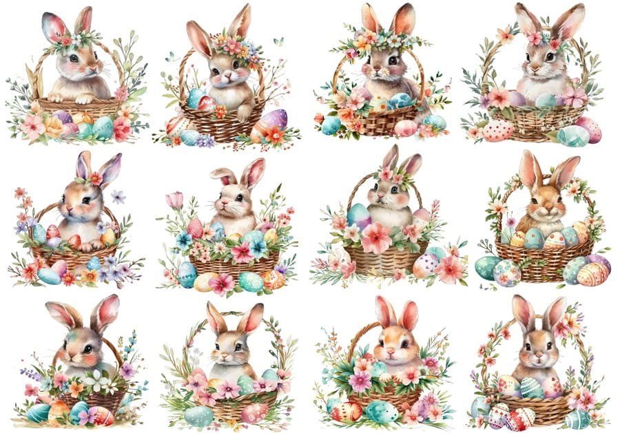 - Wielkanoc, zające, zajączki, pisanki, jajka, koszyki, kwiaty