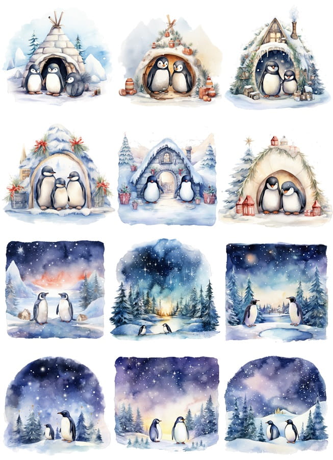 Papier klasyczny A4 do decoupage - pingwiny, ptaki, igloo, zima, noc