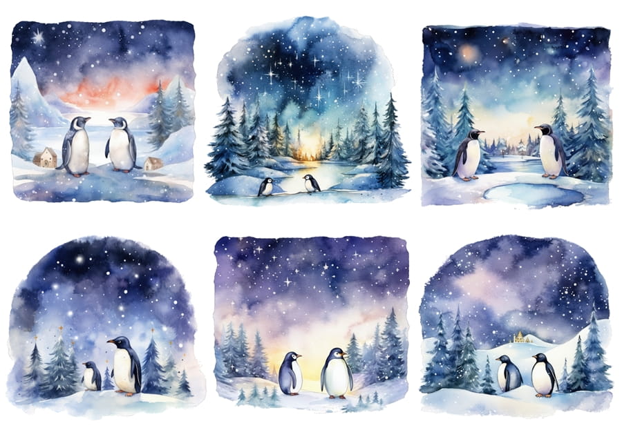 Papier klasyczny A4 do decoupage - pingwiny, ptaki, igloo, zima, noc