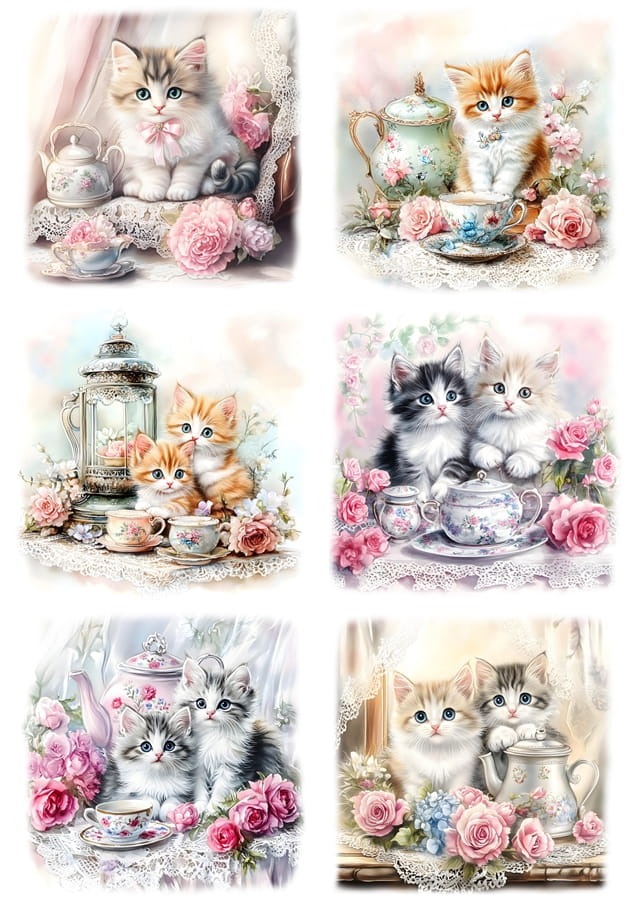 Papier ryżowy A4 Artando do decoupage - koty, kwiaty, róże, filiżanki, porcelana
