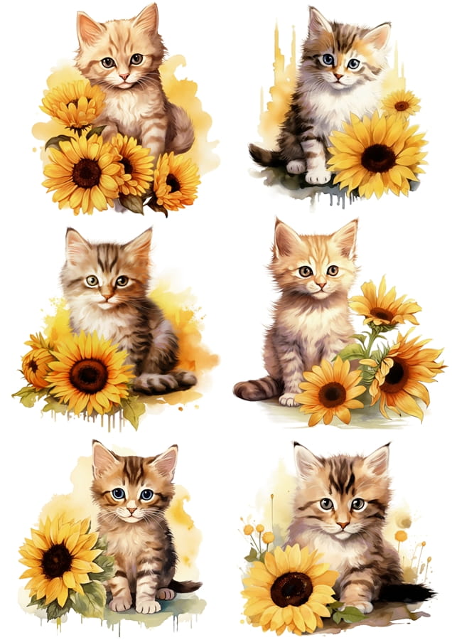 - koty, kotki, kwiaty, kwiatki, słoneczniki