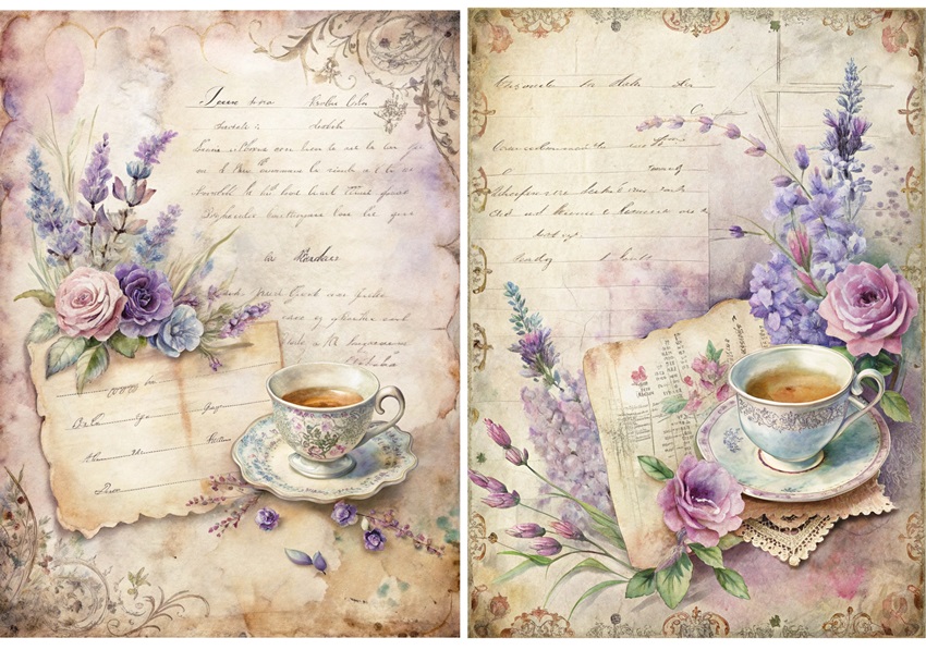 Papier ryżowy A4 Artando do decoupage - kwiaty, filiżanka, napisy, Vintage