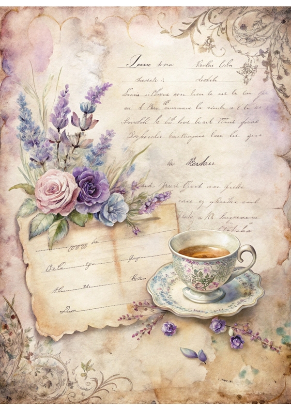 Papier ryżowy A4 Artando do decoupage - kwiaty, filiżanka, napisy, Vintage