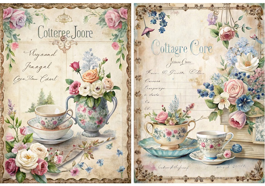 Papier ryżowy A4 Artando do decoupage - kwiaty, róże, filiżanka, napisy, Vintage