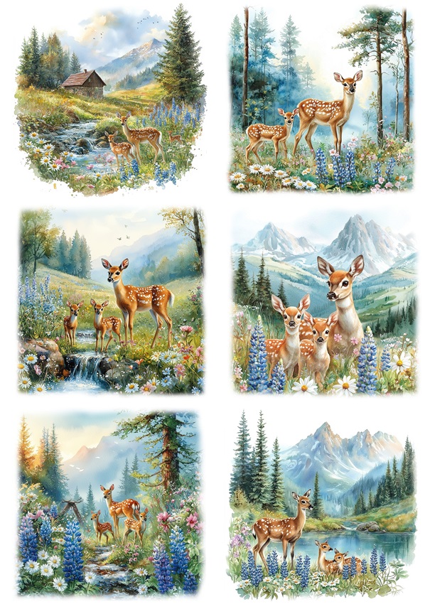 Papier ryżowy A4 Artando do decoupage - sarny, widok, las, góry, kwiaty