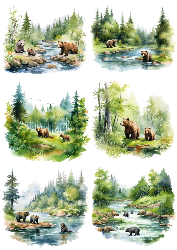 Papier ryżowy A4 Artando do decoupage - widok, pejzaż, niedźwiedzie, rzeka, las