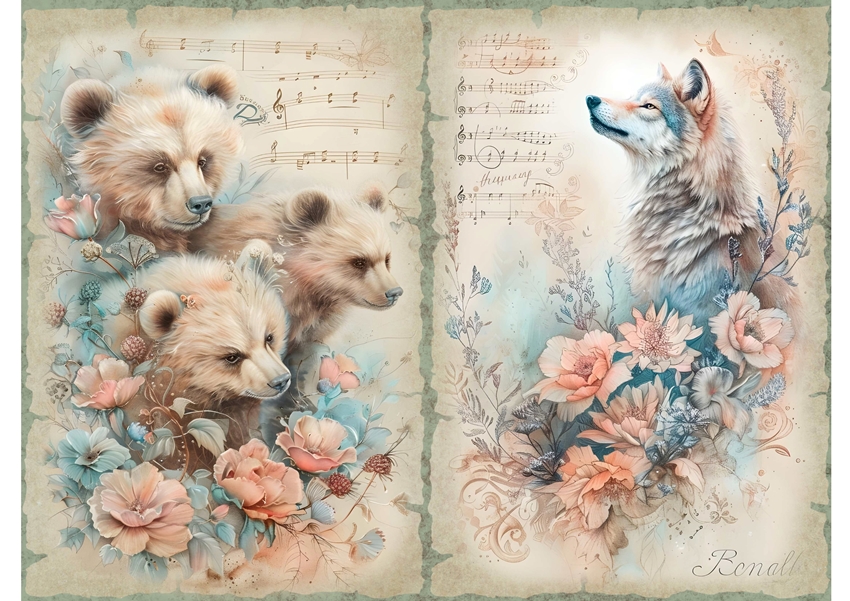 Papier ryżowy A4 Artando do decoupage - zwierzęta, wilki, niedźwiedzie, kwiaty, nuty