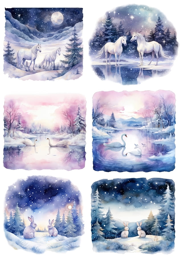 Papier ryżowy A4 do decoupage Artando - Konie, łabędzie, zające, zima, noc