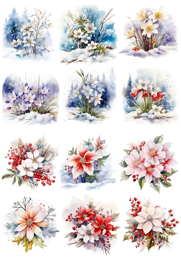 Papier ryżowy A4 do decoupage Artando - Kwiaty, narcyzy, poinsecja, zima