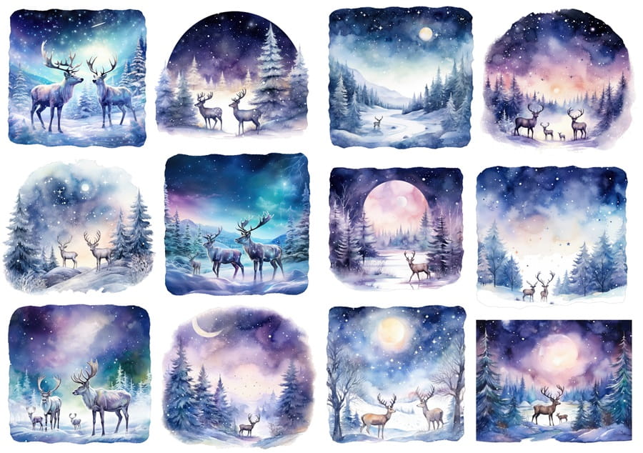 Papier ryżowy A4 do decoupage Artando - Ranifery, jelenie, widok, las, zima, noc