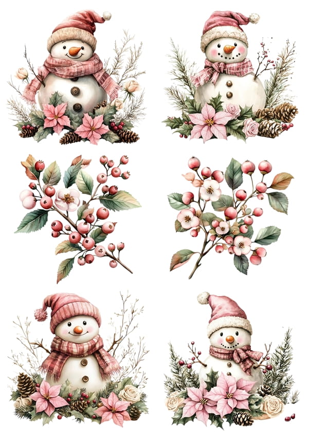 Papier ryżowy A4 do decoupage Artando - bałwany, bałwanki, głóg, stroiki, kwiaty, szyszki