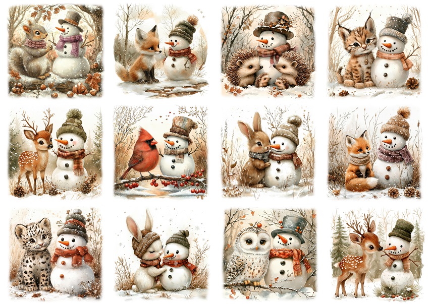 Papier ryżowy A4 do decoupage Artando - bałwany, bałwanki, zwierzęta, ptaki, zima