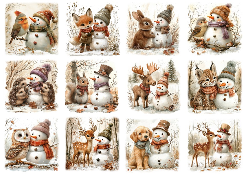 Papier ryżowy A4 do decoupage Artando - bałwany, bałwanki, zwierzęta, ptaki, zima