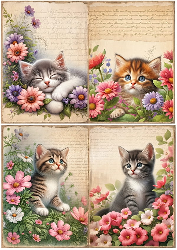 Papier ryżowy A4 do decoupage Artando - koty, kotki, kwiaty, napisy