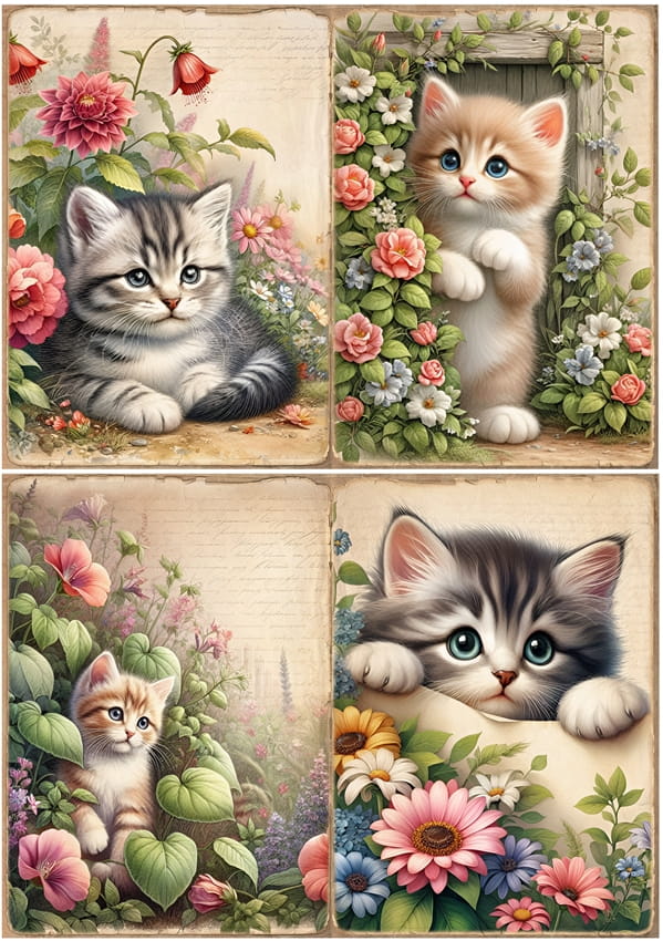 Papier ryżowy A4 do decoupage Artando - koty, kotki, kwiaty, napisy