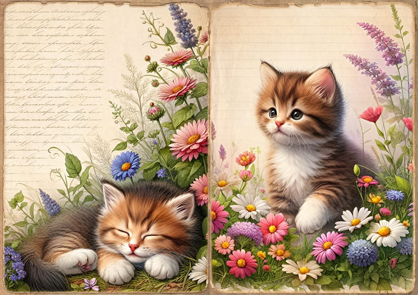 - koty, kotki, kotek, kocięta, kwiaty, kwiatki, napisy