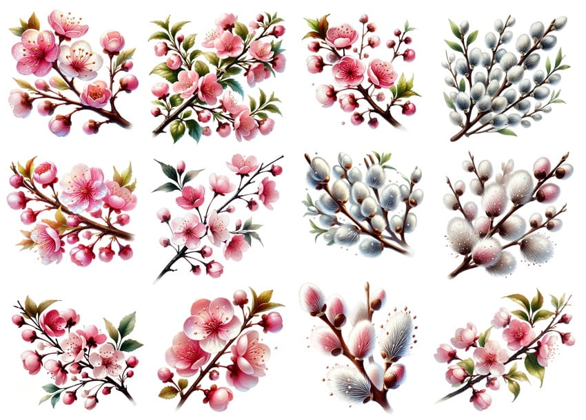 - kwiaty, kwiatki wiosenne, gałązki, bazie