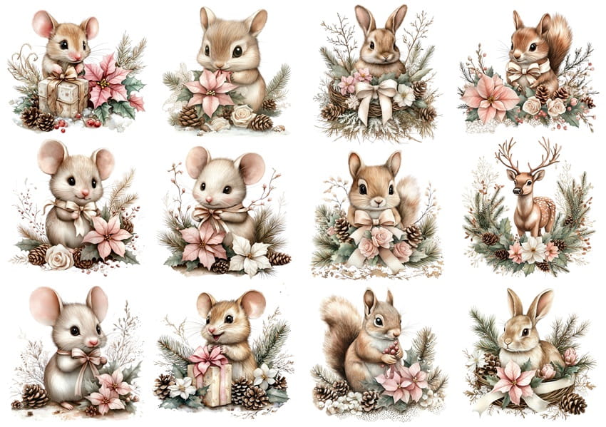Papier ryżowy A4 do decoupage Artando - myszy, zające, wiewiórki, stroiki, kwiaty, szyszki