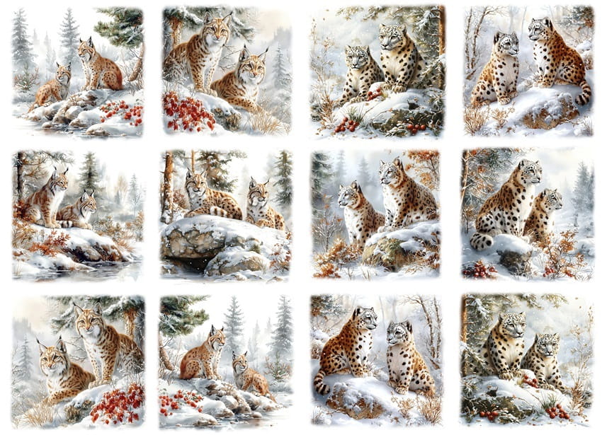 Papier ryżowy A4 do decoupage Artando - rysie, pantery, las, drzewa, zima