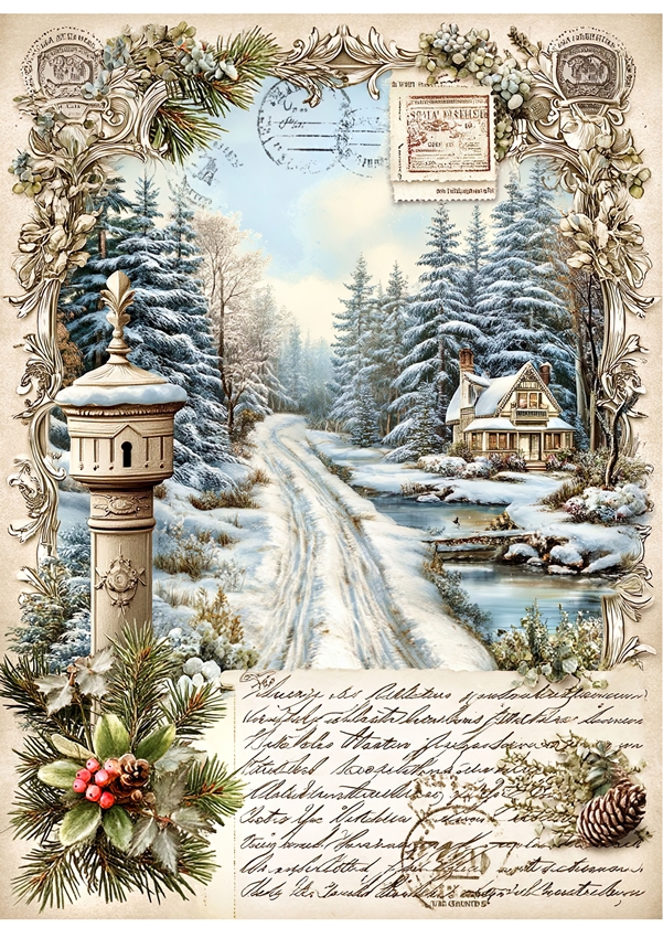 Papier ryżowy A4 do decoupage Artando - widok, pejzaż zimowy, domy, zima