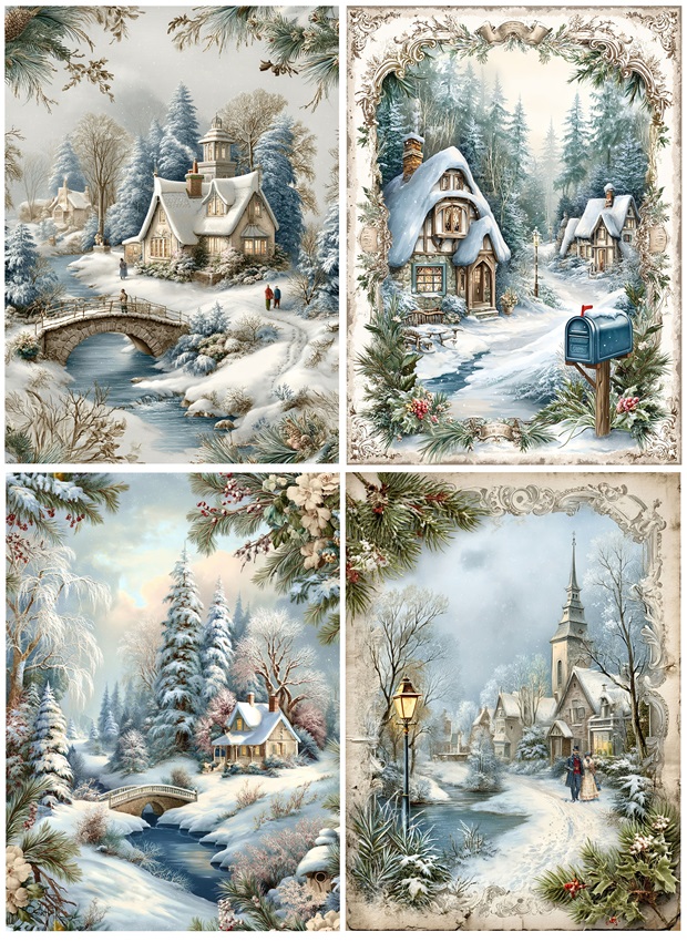 Papier ryżowy A4 do decoupage Artando -widok, pejzaż zimowy, domy, zima